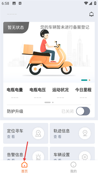 3、進入首頁顯示車輛暫未備案登記,可查看電瓶電量等車輛相關信息,還有定位尋車軌跡信息查看等功能,防護升級功能當前處于已關閉狀態。