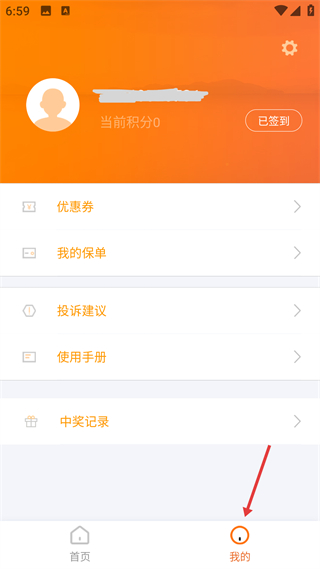 4、進入我的界面可看到當前積分,還有優惠券我的保單等功能選項,已完成簽到操作,可通過這些功能管理個人相關的車輛服務信息。