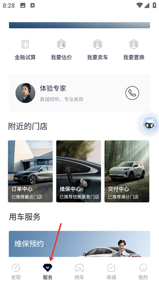 2、服務頁聚焦用車支持,含金融試算、維保預約功能,展示附近門店,是車主獲取購車及售后配套服務的平臺。
