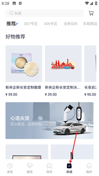 3、商城頁售賣品牌周邊與車載精品,分車型專區陳列商品,是車主獲取長安啟源專屬好物的消費入口。