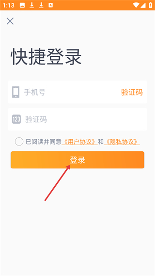 1、登錄界面,需輸入手機號、驗證碼,勾選同意用戶協議和隱私協議后點擊登錄,用于用戶賬號登錄。
