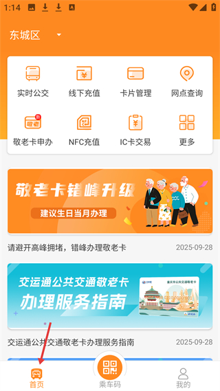 2、首頁定位東城區,設有實時公交、線下充值等功能入口,展示敬老卡錯峰升級等資訊,是公交服務主要入口。
