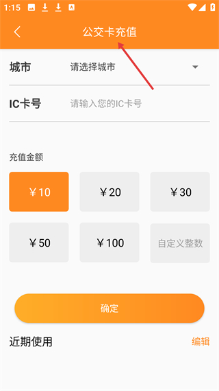 3、公交卡充值界面,需選擇城市、輸入IC卡號,選擇10元、20元等充值金額后點擊確定,用于公交卡在線充值。