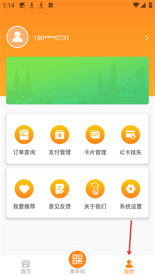4、我的界面顯示用戶手機號,有訂單查詢、支付管理等功能選項,用于用戶管理個人公交業務和賬號設置。