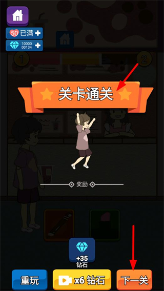 4、完成關卡任務后會顯示關卡通關界面,可領取對應的鉆石獎勵,點擊下一關按鈕即可進入后續關卡。