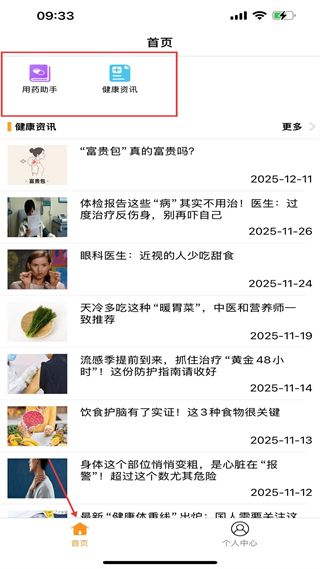 1、打開游戲看到首頁界面,界面上有用藥助手和健康資訊兩個功能按鈕,選擇用藥助手選項,就能進入對應的功能頁面開啟后續的操作流程。