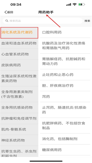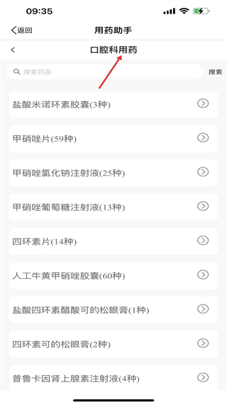2、進入用藥助手頁面后,頁面上能看到多個藥品分類選項,選擇口腔科用藥,即可進入該分類下的具體藥品列表頁面繼續后續操作。