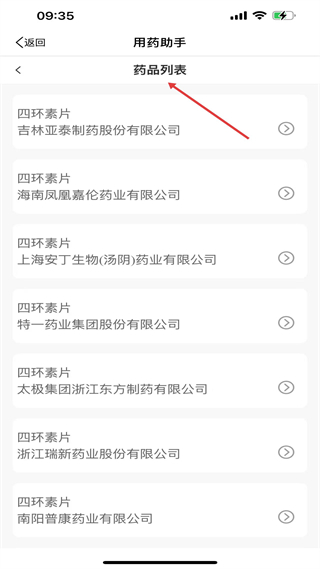 3、在口腔科用藥頁面,頁面里能看到多種藥品選項,選擇四環素片,就能進入該藥品對應的生產廠家列表頁面查看詳細信息。