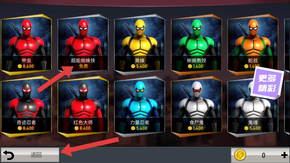2、進入角色選擇界面,能看到甲蟲,超能蜘蛛俠等多種角色,部分角色免費,選好后點擊返回,可回到主界面。