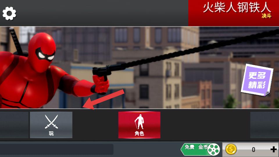 1、游戲開始,界面有玩和角色按鈕,點擊玩就能進入游戲,開啟火柴人鋼鐵人決斗的冒險。