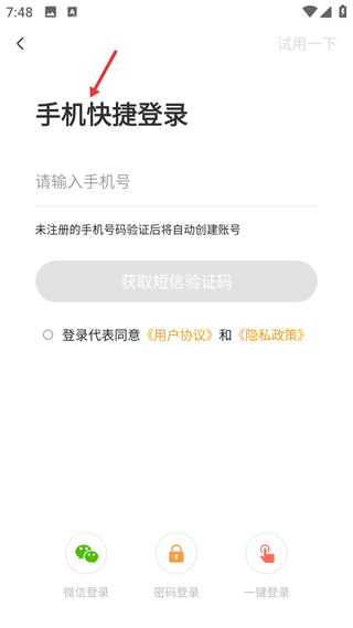 1、手機快捷登錄頁面,可輸入手機號獲取短信驗證碼,勾選同意用戶協議和隱私政策后登錄,未注冊手機號驗證后自動創建賬號,也能選微信、密碼或一鍵登錄方式。