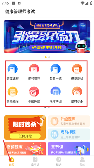 2、首頁,可見題庫課程、視頻課程等功能入口,還有限時秒殺、高頻題庫等板塊,這些功能適配健康管理師考試備考需求,可按需選擇對應板塊開啟學習。