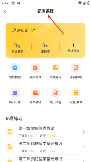 3、題庫課程頁面,能看到理論知識板塊的答題數據統計,還有智能刷題、模擬測試等功能選項,以及專項練習的章節內容,可按章節或功能開展刷題練習。