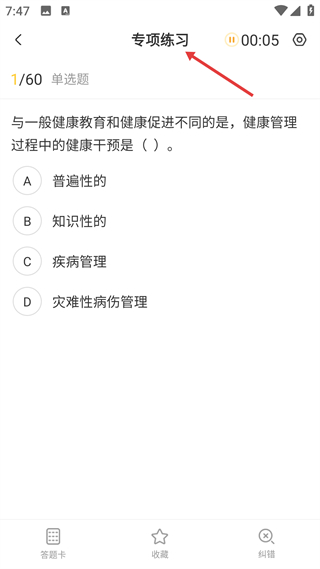 4、專項練習的題目頁面,會呈現單選題型的考題,可選擇選項作答,還能使用收藏、糾錯等功能輔助練習,按進度完成該專項的題目訓練。