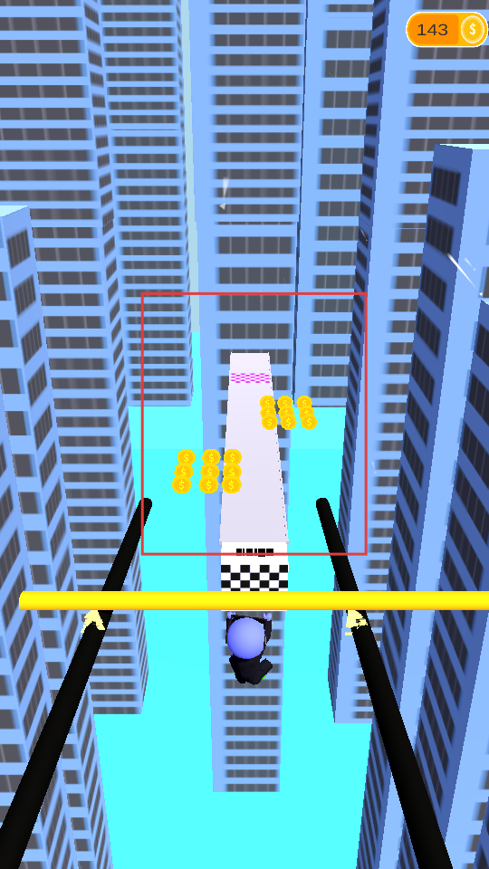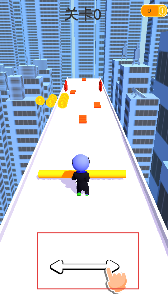 1、在城市高樓間的跑道上,操控角色左右移動,收集金幣,避開紅色障礙物,沿著跑道前進,開始跑酷挑戰。