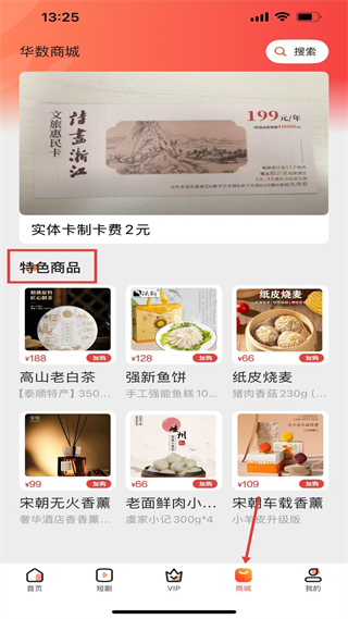 1、華數商城界面,有詩畫浙江文旅惠民卡,年費199元,實體卡制卡費2元,還有高山老白茶、強新魚餅等特色商品,可加購或下單。