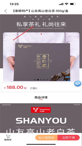 2、泰順特產山友高山老白茶,350g每盒,售價188元起,定位私享茶禮,適合禮尚往來,可加入購物車或立即下單。