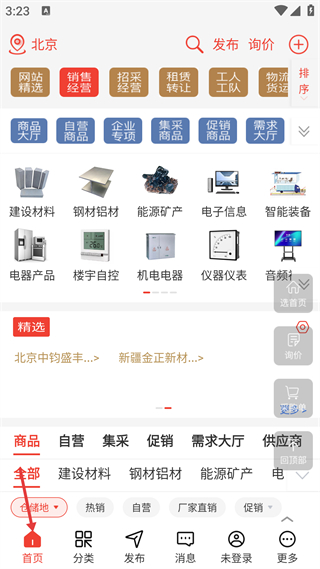 1、首頁定位北京,整合銷售、招采等經營入口,分類展示建設材料等商品,是工業商品交易的綜合入口。