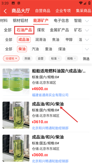 3、商品大廳聚焦能源礦產類石油產品,可按成品油等篩選,展示商品信息及價格,是采購選型核心頁面。