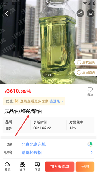4、商品詳情展示柴油的價格、品牌等信息,提供交流、采購等功能,是完成工業商品交易的關鍵入口。