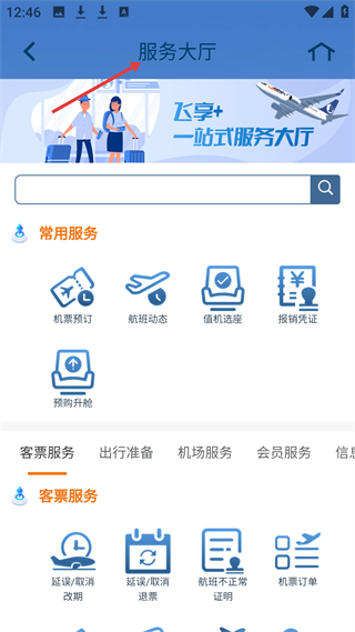 1、服務大廳頁,有常用服務和客票服務板塊,常用服務含機票預訂等功能,客票服務有延誤改期等選項,提供一站式航空服務。