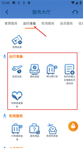 3、出行準備頁,屬服務大廳板塊,有航班動態、值機選座等功能入口,助力出行前準備。