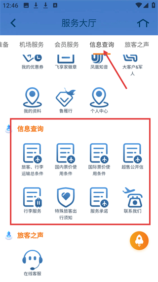 4、信息查詢頁,在服務大廳板塊,可查旅客行李運輸條件等信息,還有行李服務等功能,滿足信息查詢需求。