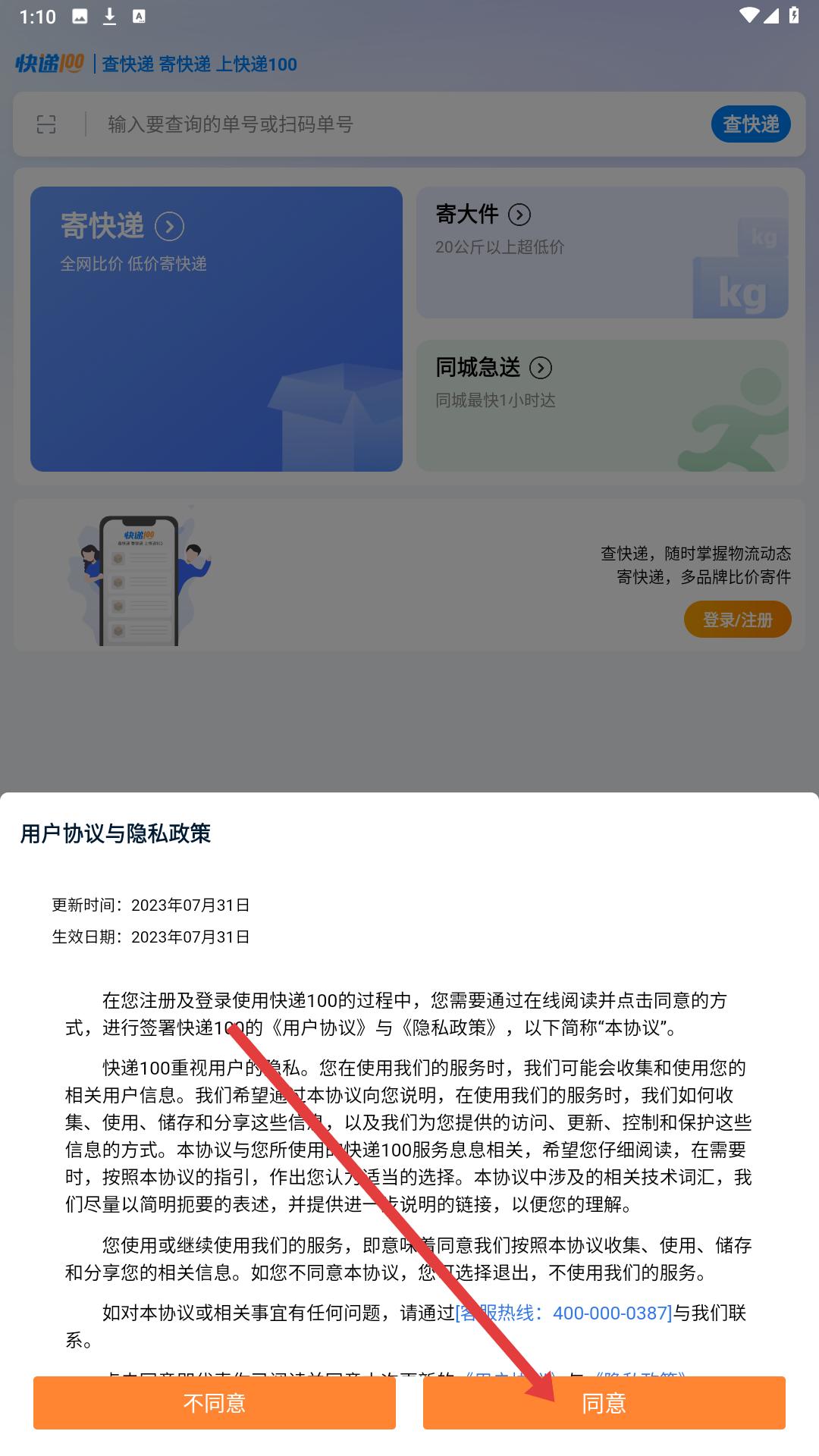 1、使用快遞100前,需閱讀并同意用戶協議與隱私政策,點擊同意后可進入平臺主界面。