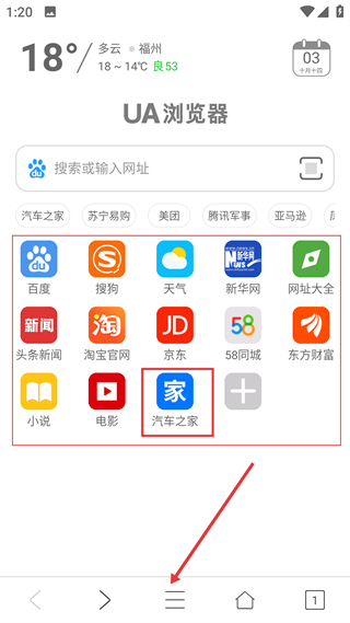 1、首頁集成天氣、快捷導航等功能,可通過搜索框訪問網站,也能直接點擊汽車之家等快捷入口,實現快速瀏覽。