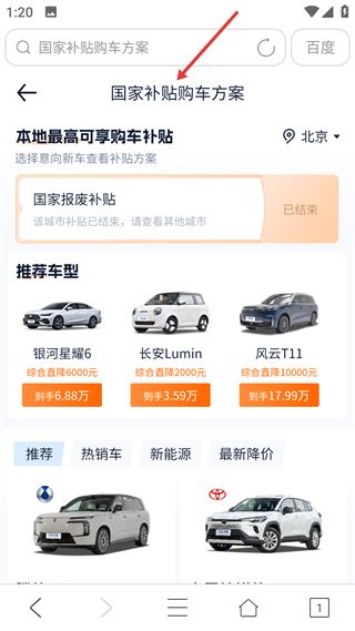 3、國家補貼購車方案頁面,可查看本地購車補貼政策,瀏覽推薦車型的優惠信息,支持按車型類型篩選,精準匹配需求。