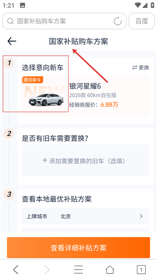 4、補貼申領流程,選擇意向新車后,可補充舊車置換信息,選定上牌城市,即可查看本地最優補貼方案,推進申領。