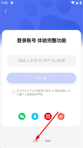 2、進入登錄賬號界面,可見賬號輸入框,下方設有注冊按鈕,點擊該按鈕進入歡迎注冊百度賬號的界面,繼續推進操作步驟。