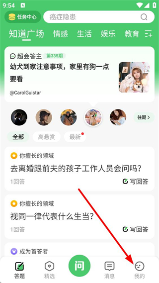 1、進入問答平臺界面,頂部設有搜索欄,中間展示各類問題內容,底部有我的按鈕,點擊該按鈕進入登錄賬號的界面,開啟后續操作流程。