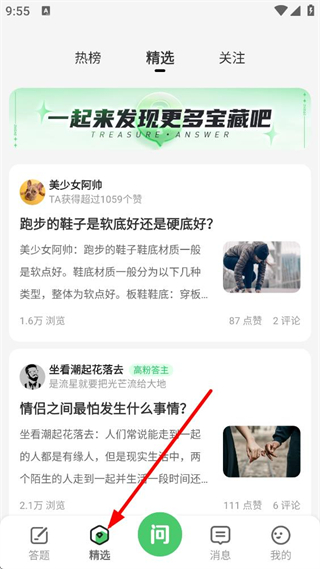 4、完成注冊登錄后,點擊底部精選按鈕,進入精選界面,該界面展示不同用戶發布的問答內容,可進行瀏覽或互動操作。