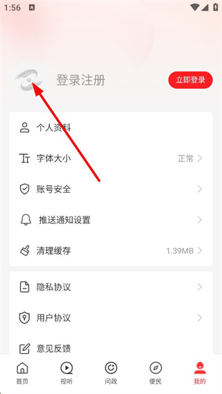 2、我的頁面點擊登錄注冊可進入登錄流程,頁面包含個人資料字體大小等設置項,還能管理賬號安全清理緩存,提交意見反饋。