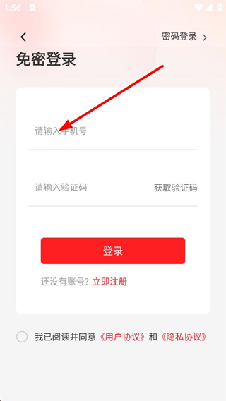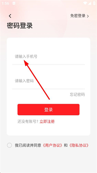 4、密碼登錄頁面需輸入手機號和對應密碼,勾選相關協議后點擊登錄,若忘記密碼可通過對應選項找回,也可切換免密登錄方式。