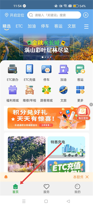 1、打開樂速通APP進入首頁,可看到ETC新辦、充值、停車等功能入口,還有積分兌好禮等活動,能享受各類出行服務。