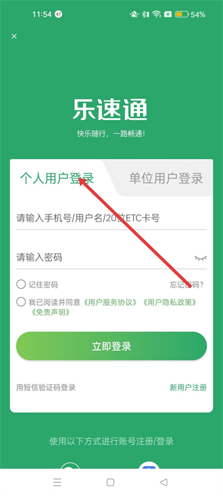 3、個人用戶登錄界面,輸入手機號、用戶名、ETC卡號和密碼,勾選同意相關協議后點擊立即登錄,也可選擇短信驗證碼登錄或新用戶注冊。