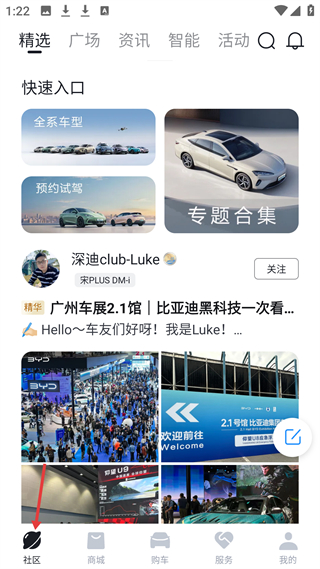 1、社區板塊設精選等分類,有全系車型展示、預約試駕入口,還有車友分享廣州車展比亞迪黑科技內容,方便用戶交流汽車資訊。