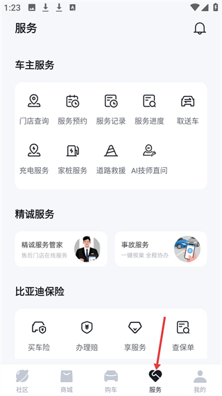 4、服務板塊含車主、精誠服務及比亞迪保險,有門店查詢、售后管家等功能,提供全方位售后及保險服務。