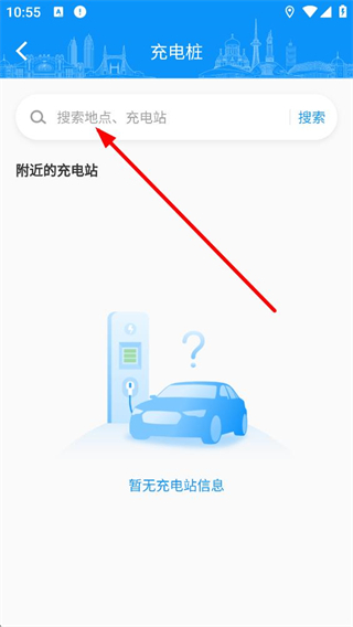 2、進入充電樁頁面后,可搜索框輸入地點或充電站名稱,點擊搜索即可查詢對應區域的充電樁信息。