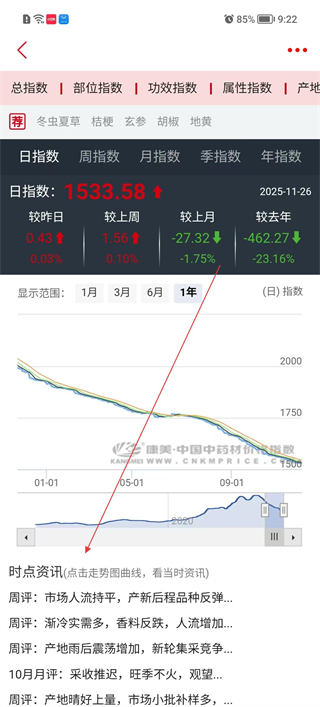 4、進入指數詳情頁面,查看日指數周指數等數據變化,選擇不同時間范圍查看趨勢,同時了解對應的周評月評內容。