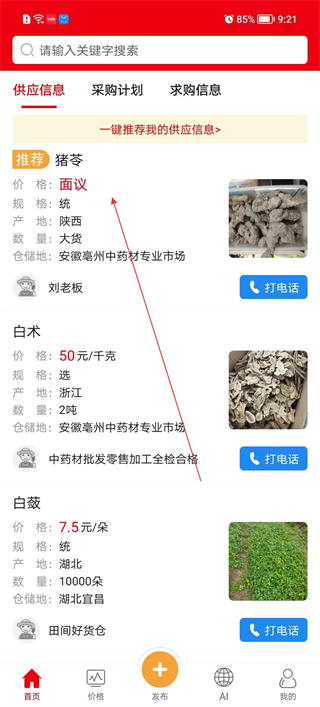 2、點擊供應信息板塊,進入對應頁面查看豬苓白術等中藥材的供應詳情,包括價格規格產地等信息,可聯系供應商。