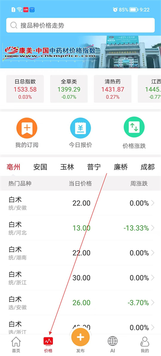 3、切換至價格頁面,查看中藥材價格指數及熱門品種的當日價格周漲跌等數據,了解市場價格動態。