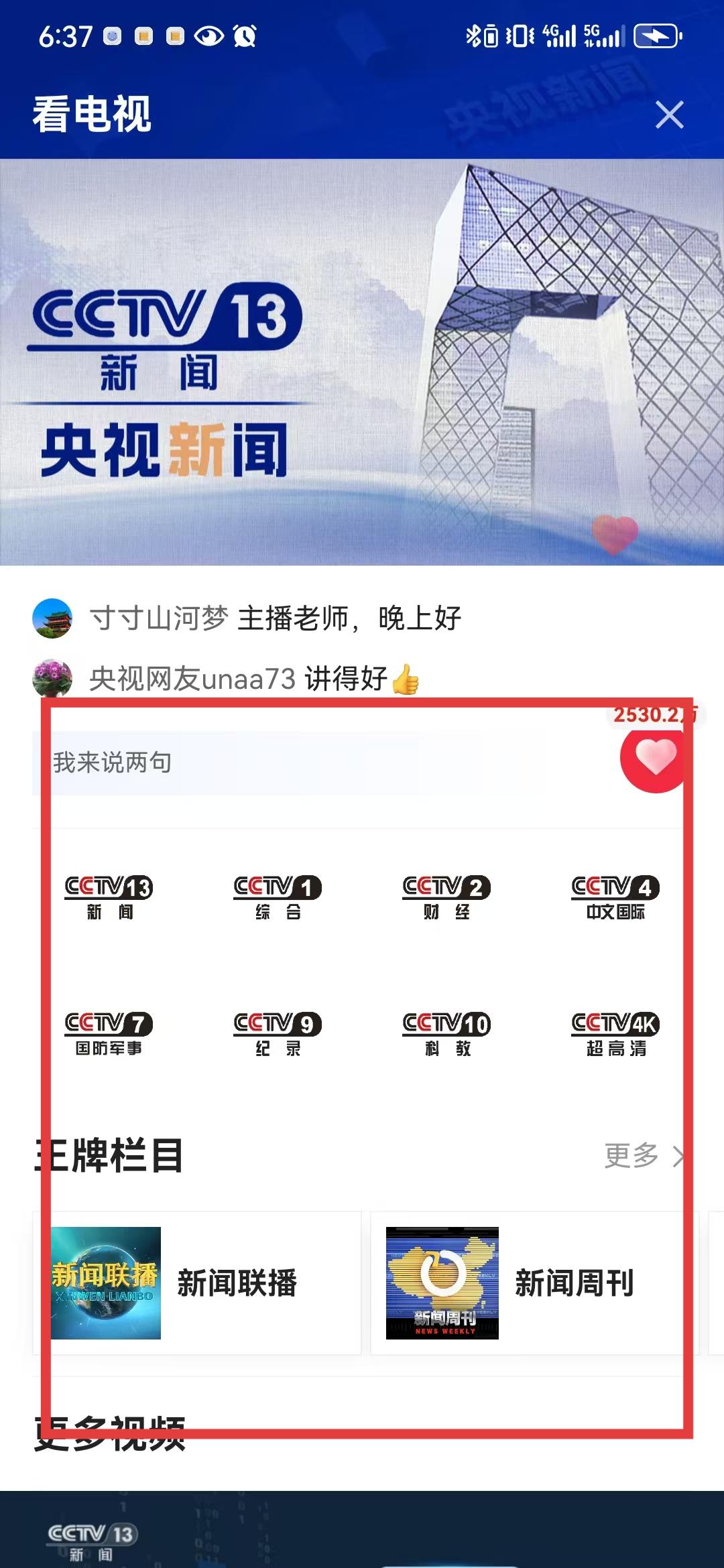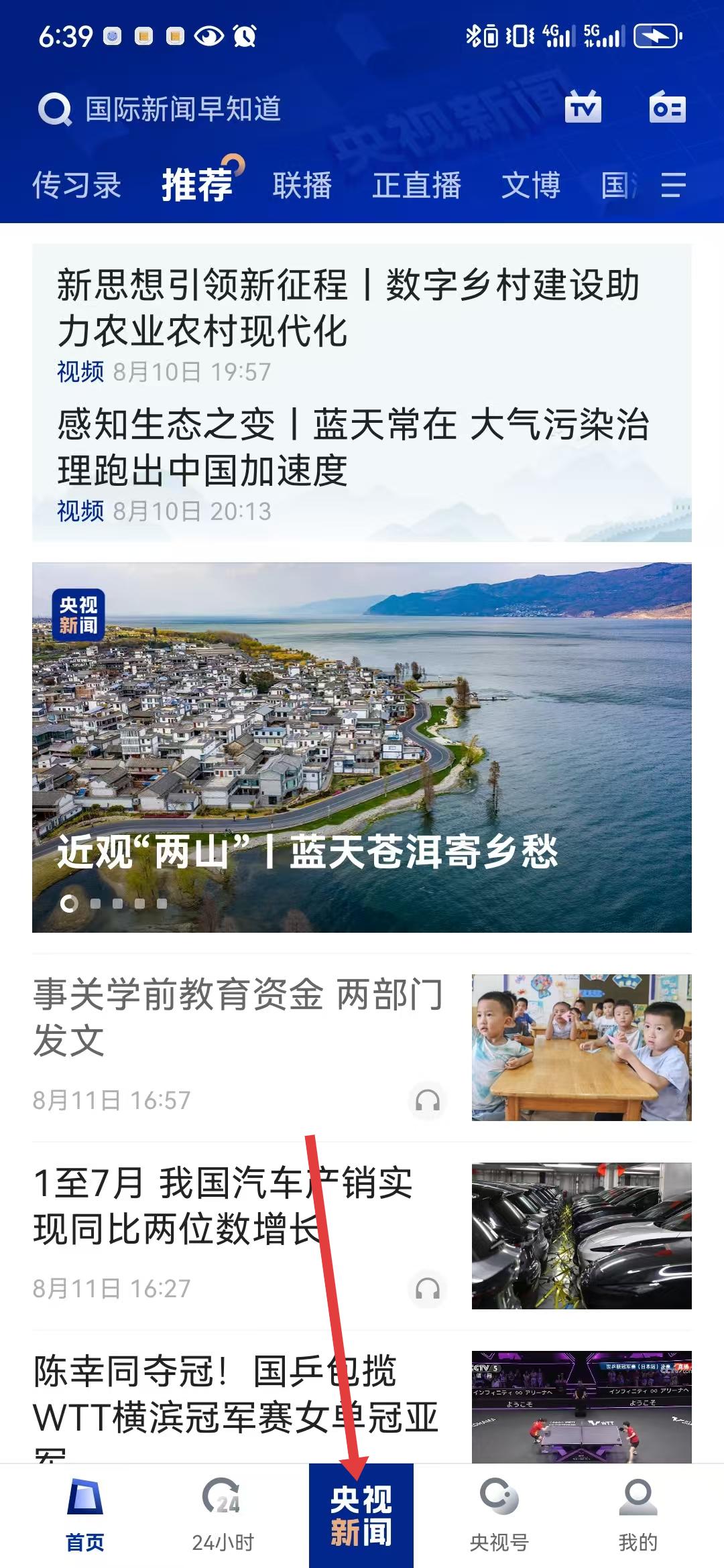 1、點擊底部導航欄中間的央視新聞圖標,切換到電視頻道相關功能區,為觀看電視直播和頻道內容搭建通道,讓你能快速找到看電視的入口,開啟電視節目觀看體驗。