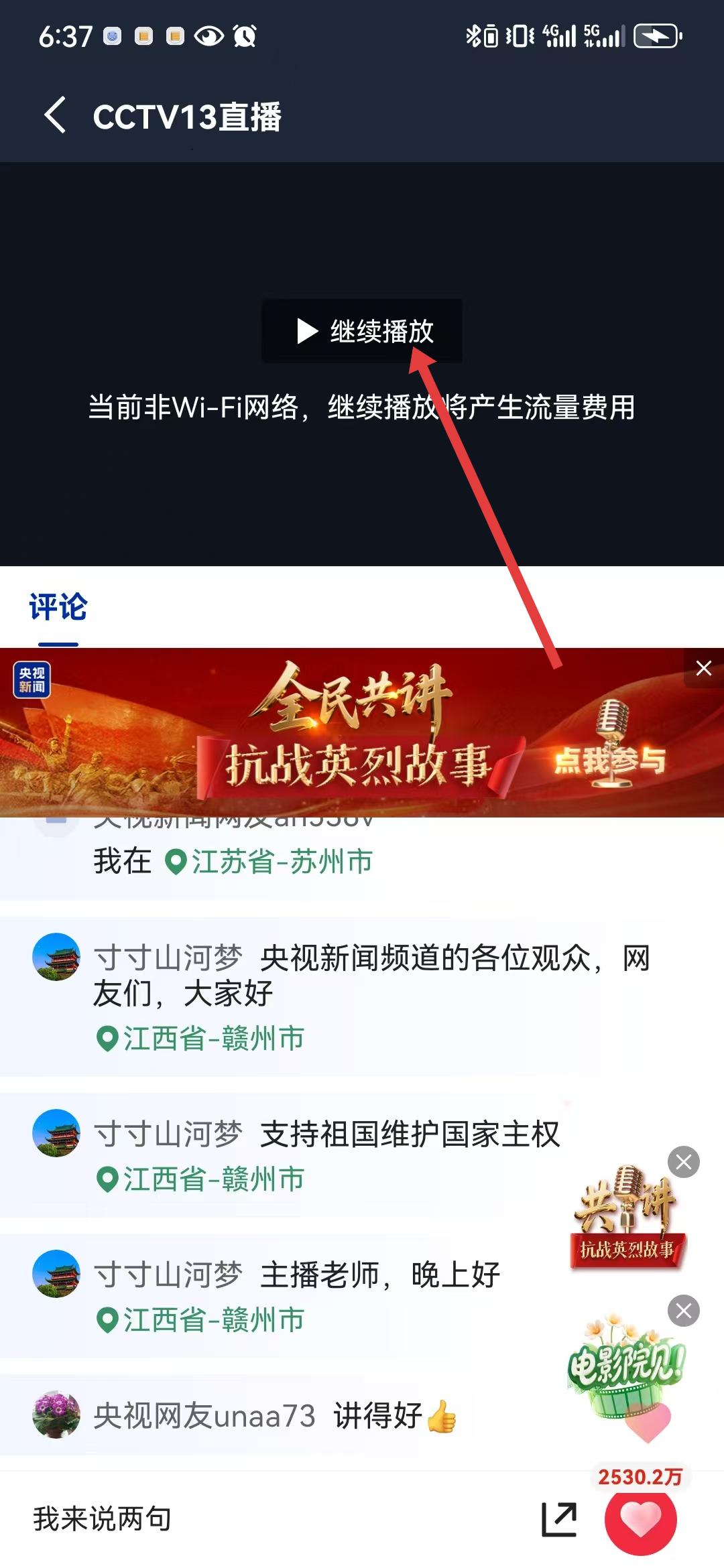 3、進入具體頻道頁面點擊繼續播放按鈕,就能觀看實時直播內容,同時頁面下方設有評論區,可發表觀點、參與互動,增強觀看的參與感與趣味性。