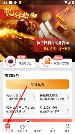 1、執行指南頁面提供執睿問答、文書撰寫功能,還有綜合查詢服務,可進行失信人、被執行人、限制高消費人員、終本案件等查詢,助力用戶了解執行相關信息。