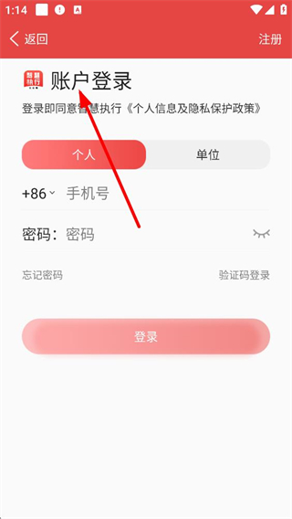3、賬戶登錄時可選擇個人或單位身份,輸入手機號和密碼,勾選協議后登錄,若忘記密碼可進行找回,也可選擇驗證碼登錄。