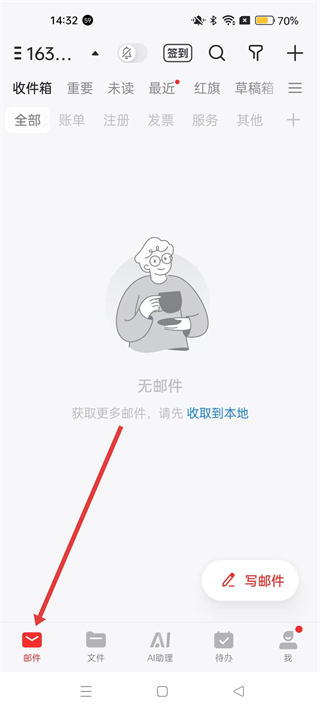 1、進入郵箱界面,可查看收件箱、重要郵件等分類,若無郵件可收取到本地獲取更多郵件,點擊寫郵件可開始撰寫新郵件。