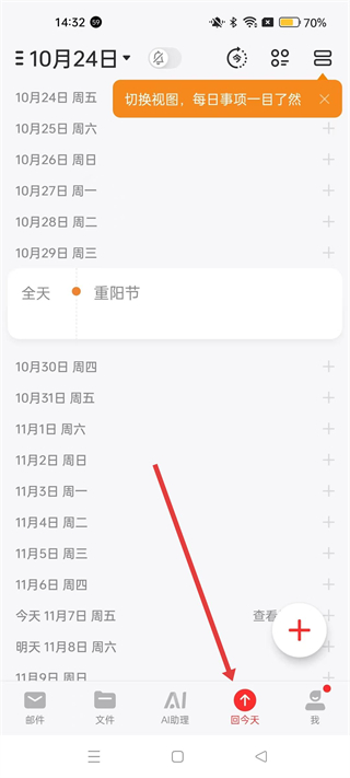 2、進入待辦界面,可查看10月24日至11月9日的日程,還有重陽節等節日標注,點擊回今天可快速返回今日日程,點擊加號可添加新待辦事項。